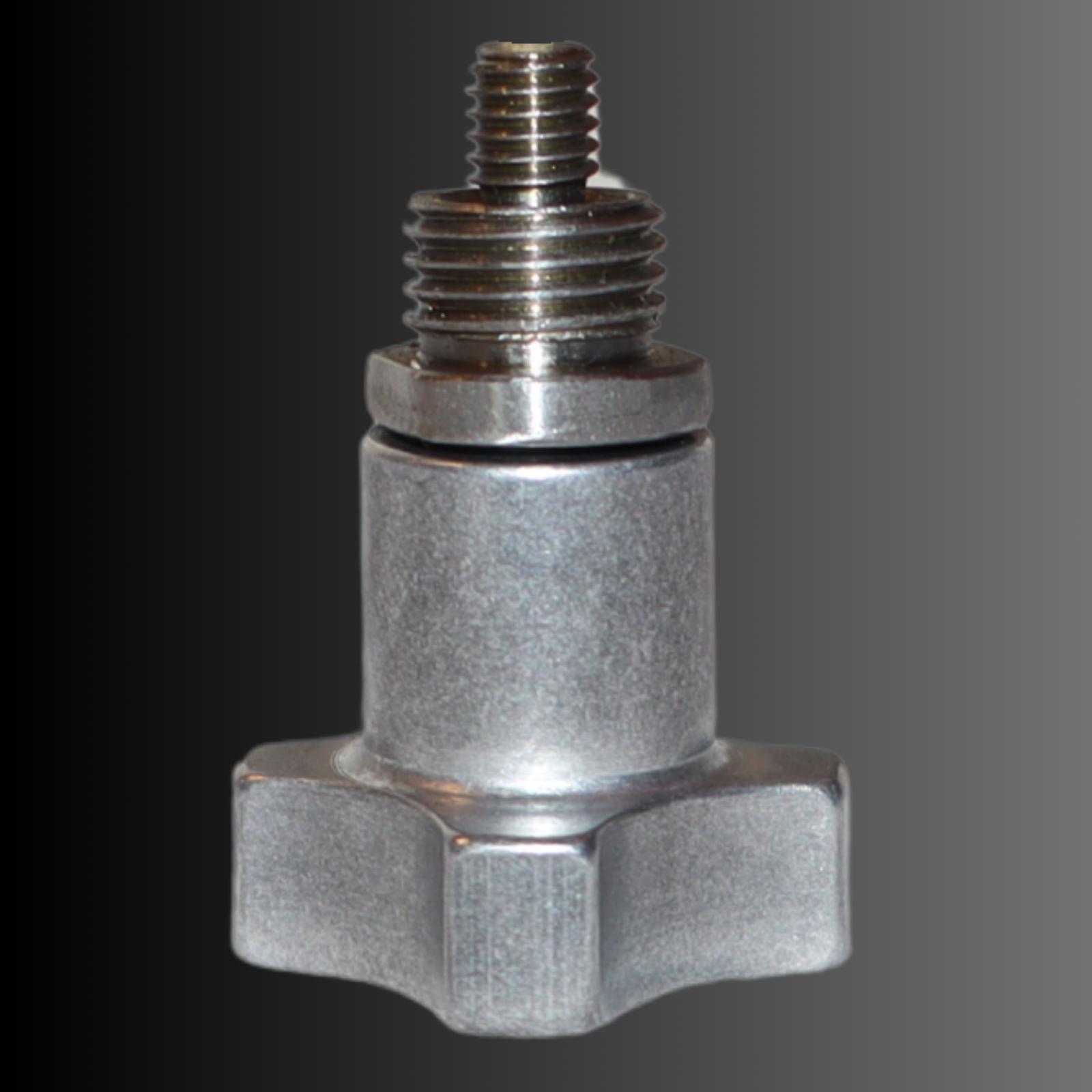Each fastener consists of a spring-loaded screw knob, shaft, and collet. Installation is quick and simple—just insert the collet into a threaded hole in the fixture and tighten. The collet includes wrench flats for easy installation.